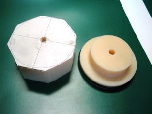 今年のNHKロボコンでは、2種類のタイヤを自作しました。1つが手動マシンに使用したシリコーンゴム成形のタイヤでもう1つがアウタートーチマシンに使用したゴムリング製のタイヤでした。自動マシンの場合、タイヤが細いほうが制御の時に何かと便利なのでR^2D^2にもゴムリング製のタイヤを採用します。