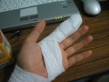 病院でレントゲン撮影しましたが骨は大丈夫だったみたいです。傷のほうはスプロケット沿いに指がぐるっと回ったのでけっこう長く、4針縫うことになってしまいました。みなさんも回転物にはご注意を。